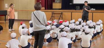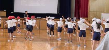合同体育です。運動会の団体演技の練習をしていました。先生の説明をしっかり聞いて練習していました。