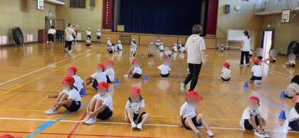 合同体育です。集団演技の場所移動を丁寧に確認しながら進めていました。しっかり憶えましょうね。