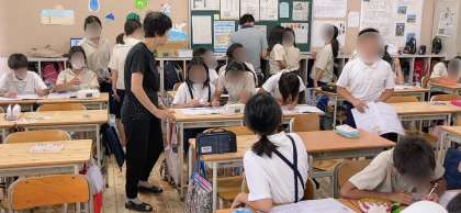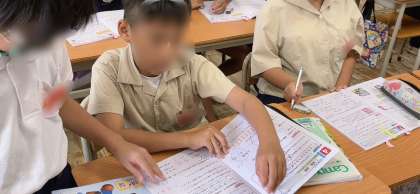 算数の学習で、算数ドリルに取り組んでいました。今まで学習したところで間違えていた箇所をやり直して先生に確認してもらってました。◯がつくまで何度でもやり直します