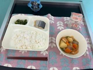 今日の献立は、さごしの塩焼き、含め煮、オクラの炒め物、ご飯、牛乳でした。ごちそうさまでした。