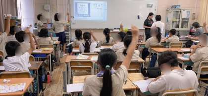 国語の学習で、新出漢字の練習をしていました。学習係が前に立ち、書き順や使用例など学習を進めていました。