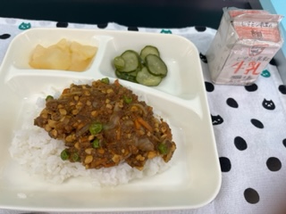 今日の献立は、大豆入りキーマカレーライス(米粉)、きゅうりのサラダ、洋梨(カット缶)、牛乳です。いただきます。