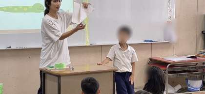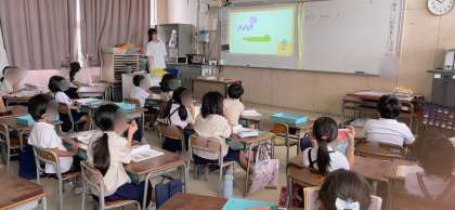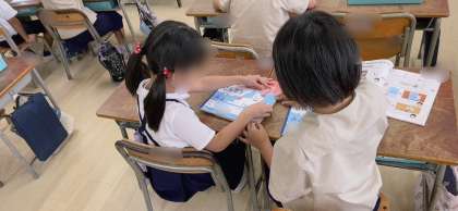 算数の学習です。長さ比べの課題です。紙の縦と横の長さを比べる方法について自分の考えを発表したり、ノートを使って隣の友だちと相談協力したりしていました。