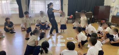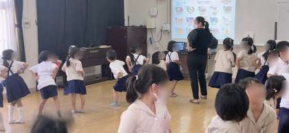 英語活動の時間でした。講師先生と英語の歌に合わせてダンスをしたりアルファベットのカードゲームをしたりして楽しんでいました