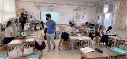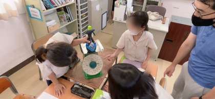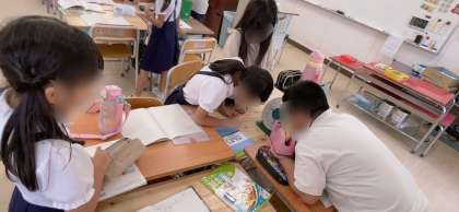 算数の学習です。重さの単元で、班で1Kgの重さをつくります。教室内のものを集めて「はかり」で量りながら1Kgをつくっていました。