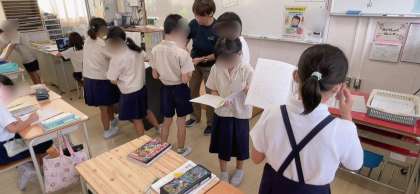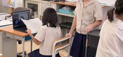 3年生の様子です。国語の学習です。「そうぞうを広げて物語を書こう」の単元です。自分で想像して作った物語を友だちと交換して読んでいました。欠席してオンライン参加している友だちと交換している子もいました。