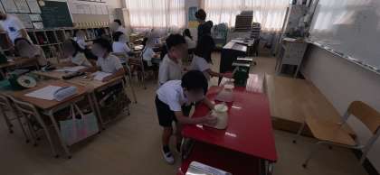 算数で重さの単元の学習です。教室にある物の重さを量ります。量る物を選んだらその重さを予想します。次に量れる最大値が違う3つ「量り」(2Kg、1Kg、500g)のどれで量ったらいいかを考えて、量りたい物に合った量りを使って計量していました。