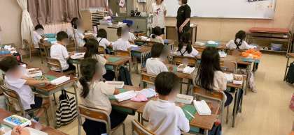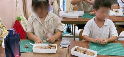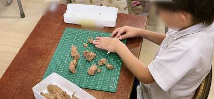 1年生の様子です。図工の学習です。粘土で食べ物を作っていました。何を作っているかは秘密で、後で当て合いっこするそうです。子どもたちは楽しみにしています。