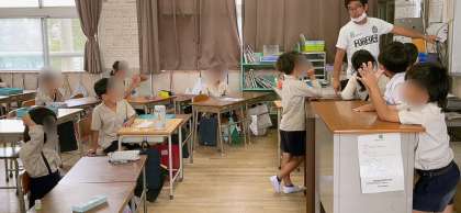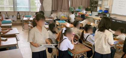 係活動の様子です。あそび係が中心になって、みんなあそびの一週間のメニューを決めていました。残りの時間、連絡帳を書くようです。つぎは、配り係が活躍していました。