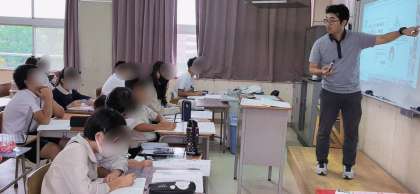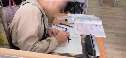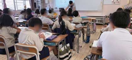 算数の分割学習の様子です。三角形の拡大図について、それぞれのグループで学習しています。どのグループも、拡大する時のポイントをしっかり頭に入れて取り組んでいます。