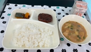 今日の献立は、和風ハンバーグ、味噌汁、かぼちゃのいとこ煮、ご飯、牛乳でした。ごちそうさまでした。