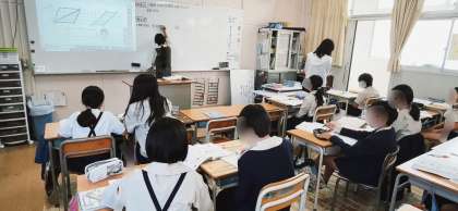 算数の分割学習の様子です。三角形や平行四辺形などの面積を求める学習です。面積を求める公式に必要な図形の「高さ」はどれかを考えていました。