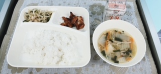 今日の献立は、鶏肉のチリソース焼き、焼豚とワンタンの皮のスープ、切り干し大根の胡麻からみづけ、ご飯、牛乳です。おいしそうですね、いただきます。