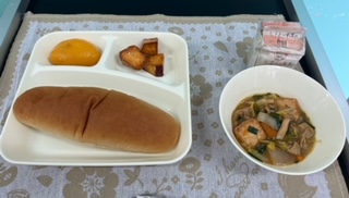 今日の献立は、豚肉とイカの中華煮、大学イモ、黄桃(缶)、黒糖パン、牛乳です。いただきます。