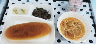 今日の献立は、牛肉の香味焼き、帆立貝とトマトのスープスパゲッティ、白菜のピクルス、パンプキンパン、牛乳です。しっかり食べて、午後からも元気に活動しましょう。いただきます。