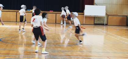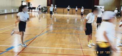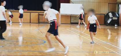 体育の学習です。体育館でしっぽとり鬼をしていました。相手の腰につけているタグを取り合います。フラッグフットボールにつなげる運動です。