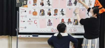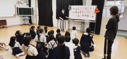 英語活動の時間でした。ハロウィンのカードを使って神経衰弱ゲームで盛り上がっていました。