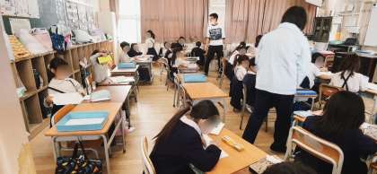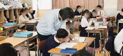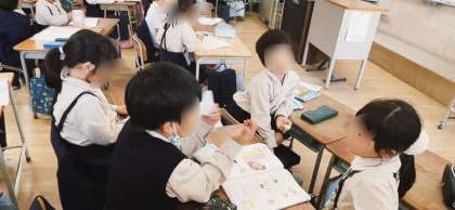 算数の学習です。九九の問題を考え、友だちと出し合っていました。