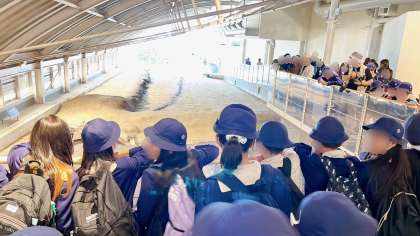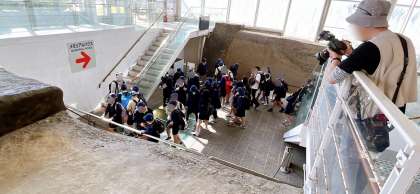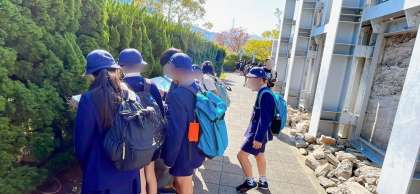一行は震災記念館の見学に入っています。野島断層を見ながら説明を聞いたり、残った壁の説明見たりしています。