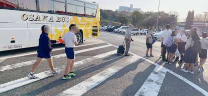 一行は、休憩地の名谷パーキングエリアに着きました。トイレを済ましたらすぐに出発します。今のところ、学校まで1時間強とのことです。