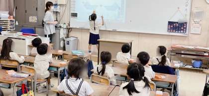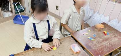 算数の学習です。三角形のタイルを組み合わせて形をつくる学習をしていました。白板に映っている図形にするにはタイルをどう動かせばいいか考えていました。