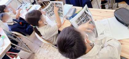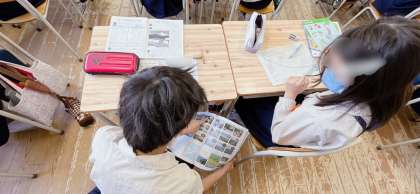 理科の学習です。水の流れによって運ばれた石の形や大きさなどが変化していく様子を、教科書を参考にしながらプリントにまとめていました。