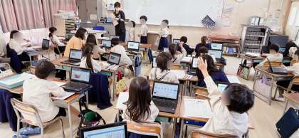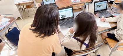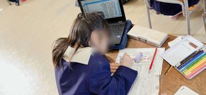 国語の学習です。乗り物の説明文の単元で学習した乗り物について、自分が紹介したい物の紹介文を作っていました。タブレット端末で写真も貼り付けた下書きを作って、その下書きをプリントに写していました。