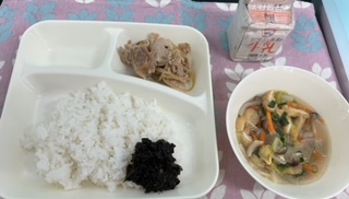 今日の献立は、豚肉のスタミナ焼き、すまし汁、海苔の佃煮、ごはん、牛乳でした。ごちそうさまでした。
