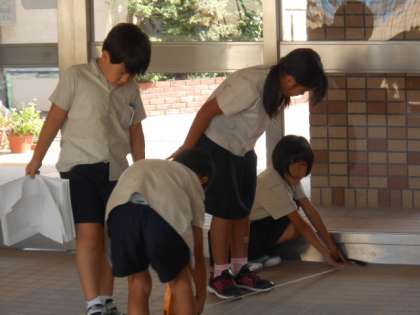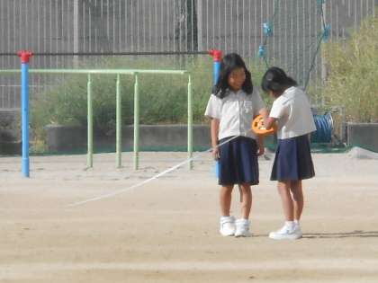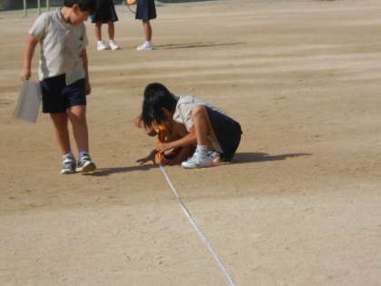 3年生がメジャーをもって運動場にいます。「何の勉強?」と聞くと、「学校のいろいろなところの長さをはかっています。」と答えました。「長いものの長さ調べ」をしていました。