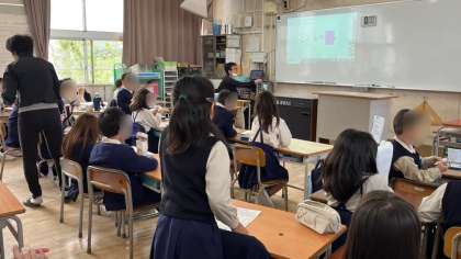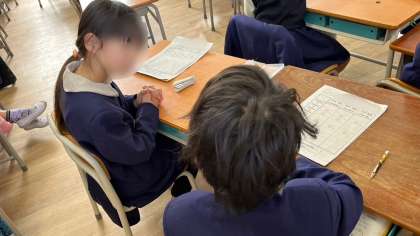 算数の学習です。九九のテストをしていました。白板にランダムに出てくる九九を答えていました。合格で九九カードに合格証印がもらえます。