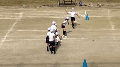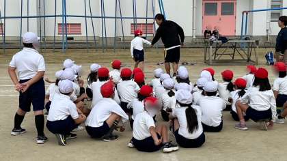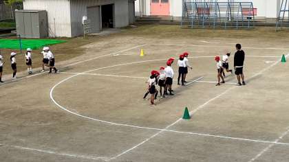 1・2組合同体育です。リレーのパスの練習をしていました。先生からバトンパスの仕方の説明を受けてからグループ練習に入りました。