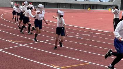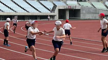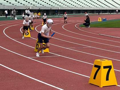 次の競技は、100m×4リレーです。世界大会が行われる競技場のトラックで一所懸命バトンをつなぎました。