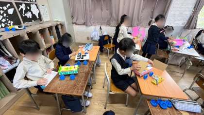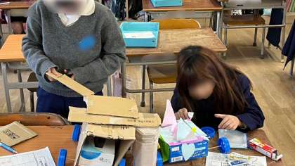図工の学習で、動く車を作っていました。車体や装飾には、お家で用意してもらった段ボールや紙箱などを使っています。