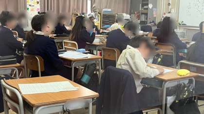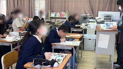 上段は1組、算数の比例・反比例の単元で算数ドリルの答え合わせをしていました。下段は2組、理科の学習で火山活動や地震などについての調べ学習の予定を立てていました。
