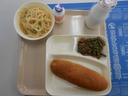 10月4日(金)今日の給食は、牛肉と三度豆のソテー、トマトのスープスパゲティ、発酵乳でした。