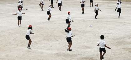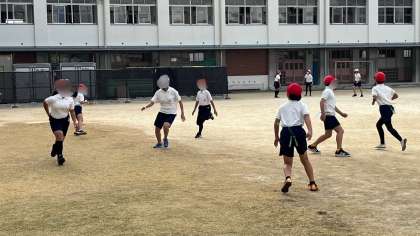体育の学習です。しっぽ取り鬼で運動場を走り回って体を温めたあと、縄跳びで色々な技に挑戦していました。
