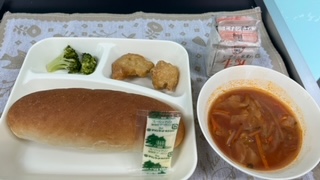 今日の献立は、白身魚のフリッター、ミネストローネ、ブロッコリーのサラダ、コッペパン、ソフトマーガリン、牛乳でした。ごちそうさまでした。