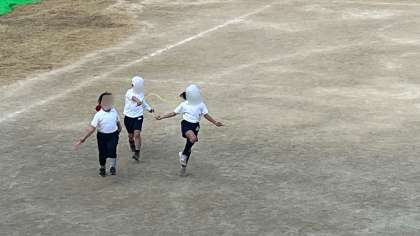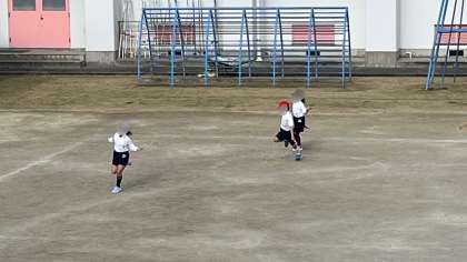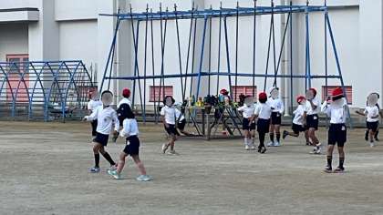 体育の学習です。鬼ごっこで身体を温めました。運動場を目一杯走り回りました。次は、縄跳び。縄跳びしながらトラックを一周していました。