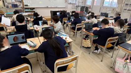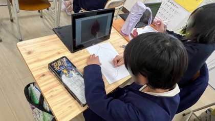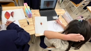 図工の学習です。校庭で拾った落ち葉をデッサンしていました。実物やタブレット端末で撮影した写真などをよく見ながら細かいところも丁寧に描いていました。