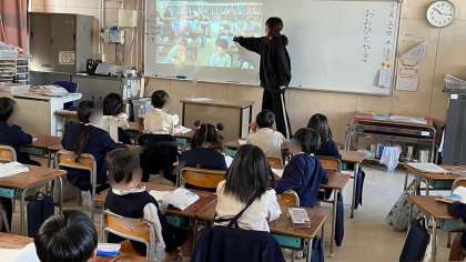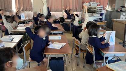 国語科の学習です。一斉音読の様子をビデオ撮影し、みんなで観ました。口の開け方や教科書の持ち方などそれぞれの様子がはっきりし、自分の課題がつかみやすいです。