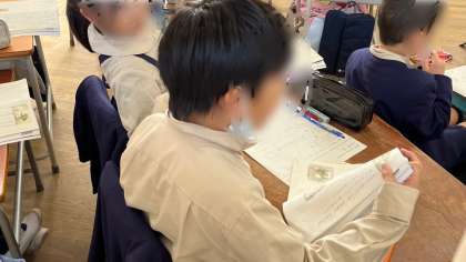 国語の学習です。物語文の読み取りで、先生が文章を動作で表しているのを見ながら、主人公の気持ちを想像していました。