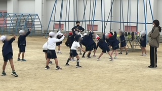 体育の学習です。体育係が準備体操を指揮していました。