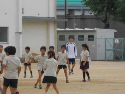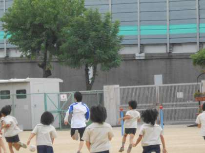 教育実習生のU先生が運動場狭しと走り回っています。