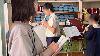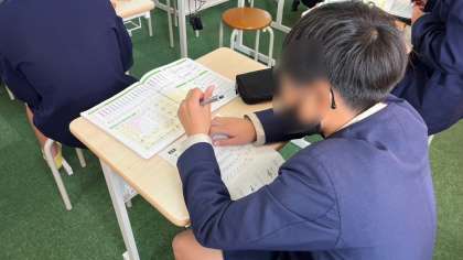 音楽の学習です。リコーダーのテストをしていました。待っている人はプリント等に取り組んでいました。