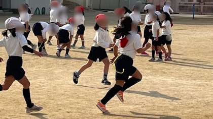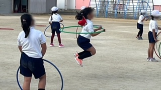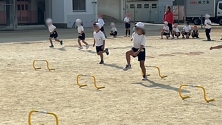 体育の学習です。しっぽ取り鬼で思い切り走り回って体を温めたあと、体育用リングやミニハードルなどを使ってさまざまな動きを楽しんでいました。