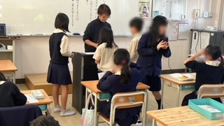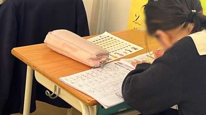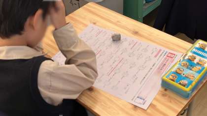 国語の学習です。漢字ドリルやプリントなどやり直しもふくめて反復練習していました。先生にチェックしてもらいながら頑張っていました。