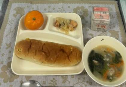 今日の献立は、鮭のマリネ、肉団子と麦のスープ、みかん、おさつパン、牛乳でした。とても美味しかったです。ごちそうさまでした。