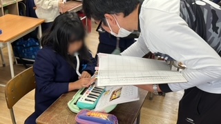 音楽の学習です。鍵盤ハーモニカの個人練習とテストをしていました。