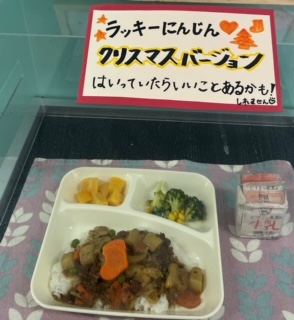今日の献立は、冬野菜のカレーライス、ブロッコリーとコーンのサラダ、黄桃(カット缶)、牛乳です。今日のカレーライスには、ラッキーにんじんクリスマスバージョンで長靴型や星型などに切ったにんじんが入っているそうです。楽しみですね。いただきます。