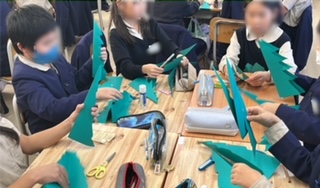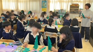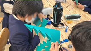 1・2組合同でクリスマスツリーを作っていました。今日はツリーの本体作りでした。